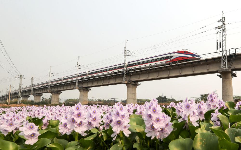 2023年4月13日,中老铁路开行国际旅客列车,从老挝万象站驶出的D888次“澜沧号”列车行驶在云南省西双版纳州境内的中老铁路橄榄坝特大桥上。新华社记者单宇琦摄