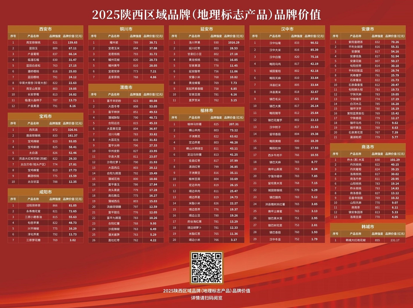 会上发布了《2025陕西品牌价值TOP100》榜单、2025陕西区域品牌(地理标志产品)品牌价值评价结果及2025年“陕西好商标”评价结果,集中展示陕西省品牌建设成效;同时,发布陕西区域公共品牌助力经济高质量发展成果案例,总结可复制推广的品牌建设范式。本次评价中,“银桥”“红星·软香酥”等122个商标获评2025年“陕西好商标”,“旭峥果蔬”等11个商标获评2025年“最具成长潜力商标”。截至目前,全省共有“陕西好商标”270个,涵盖食品、医药健康、农产品、设备制造等多个类别。品牌价值评价TOP100总价值达5407.61亿元,其中品牌价值超过100亿元的有13家;区域品牌总价值达6119.67亿元,其中品牌价值超过100亿元的地理标志产品有7个。