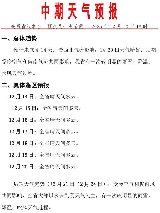 陕西省气象台12月10日16时发布中期天气预报,预计未来4-14天:受西北气流影响,14-20日天气晴好;后期受冷空气和偏南气流共同影响,陕西省有一次较明显的雨雪、降温、吹风天气过程。