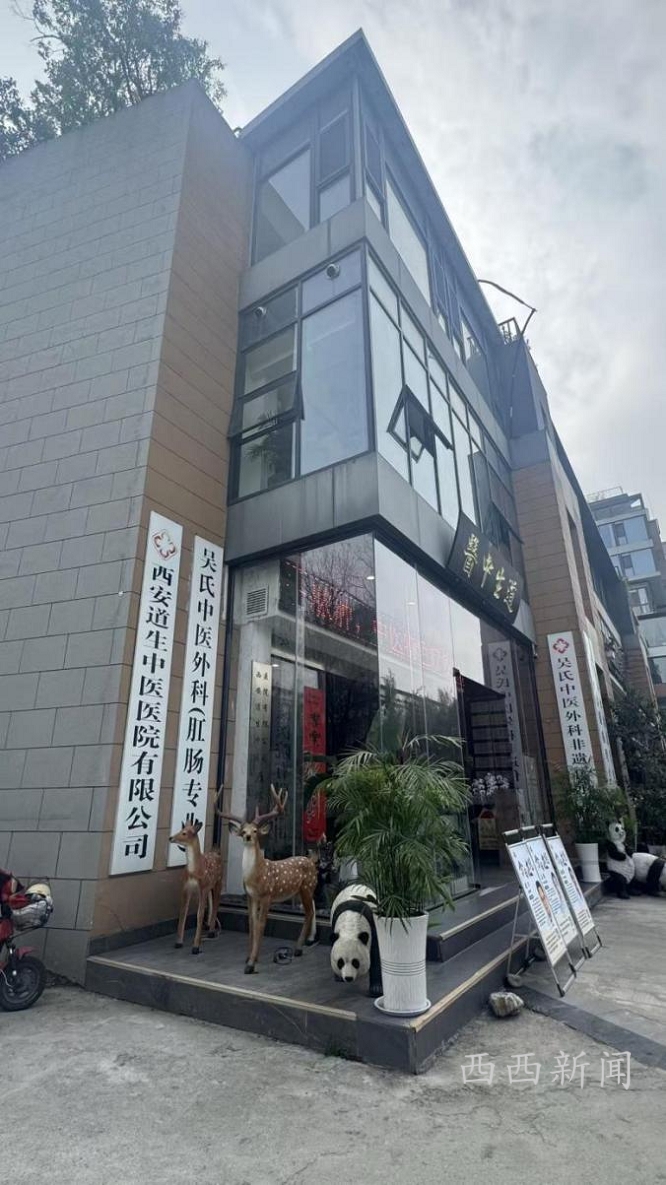 4月初,西西新闻记者来到西安曲江新区南湖北路,在金地湖城大境小区门口商业区看到,一家名为“西安道生中医医院有限公司”的商铺,在楼体外围通过玻璃隔断、封闭围挡的方式,搭建三层建筑物并投入使用,改变了商业建筑原有规划结构与外立面风貌。