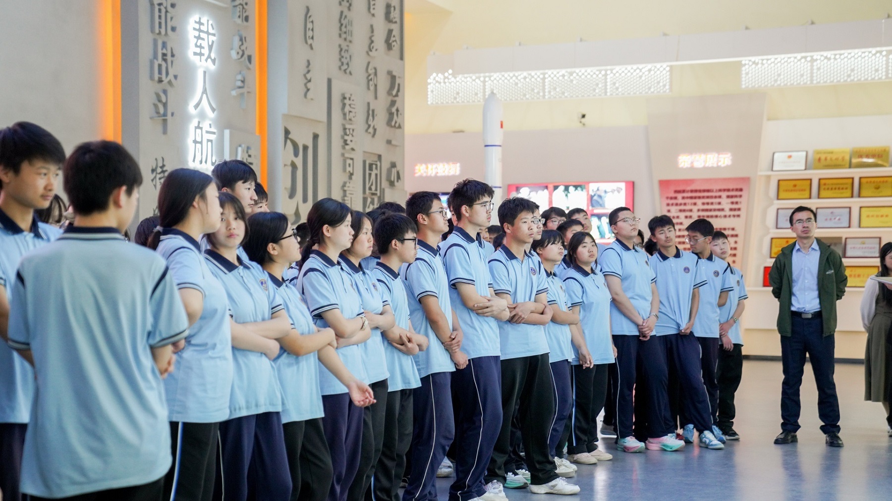 在航天历史展区,同学们驻足凝视着新中国航天的奋进足迹:从创业初期的筚路蓝缕,到突破技术封锁的关键攻坚,直至如今在世界航天领域占据重要地位。讲解员深情讲述的“三次创业”历程——黄沙戈壁拓荒的艰苦奋斗、协同攻坚的载梦同舟、星链耀世腾飞的科技创新,让同学们深刻体悟“特别能吃苦、特别能战斗”的航天品格。航天四院展览馆中陈列的实物模型与珍贵影像,让书本上的历史鲜活起来,先辈们在数据流淌的星河里追寻报国初心的故事,深深打动着每一位学子。