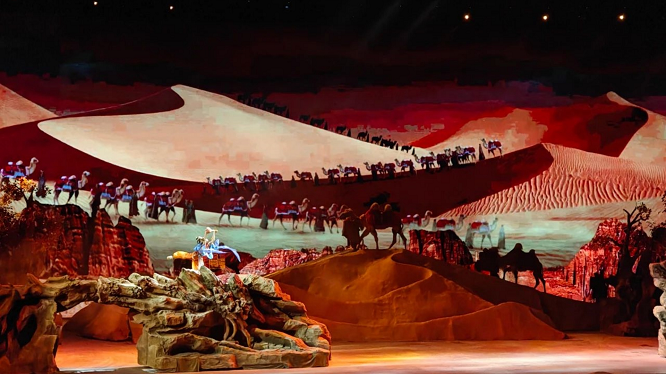 转战《驼铃传奇》秀场,学生们瞬间穿越千年。360°旋转舞台配合全息投影,让黄沙漫天的丝路商队、清泉涌动的绿洲幻境在眼前流转。当“狼群夜袭”场景突然触发座椅震动特效,不少孩子紧张得攥紧扶手;而“天降瀑布”时,前排观众真能感受到细密水雾扑面而来。“原来历史可以这么‘玩’!”研学手册上,密密麻麻记满了光影艺术与史实考据的对照思考。