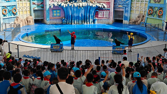 压轴登场的海狮互动环节成为科学思维训练的生动课堂。胖乎乎的海狮们一摇一摆地走上舞台,憨态可掬的模样瞬间萌化了同学们的心。它们表演了接圈、顶球、倒立等精彩节目,还会模仿人类拍手、算术。海狮们的出色表现,不仅为同学们带来了欢乐,更让他们了解到这些海洋生物独特的生存技能和聪明才智。