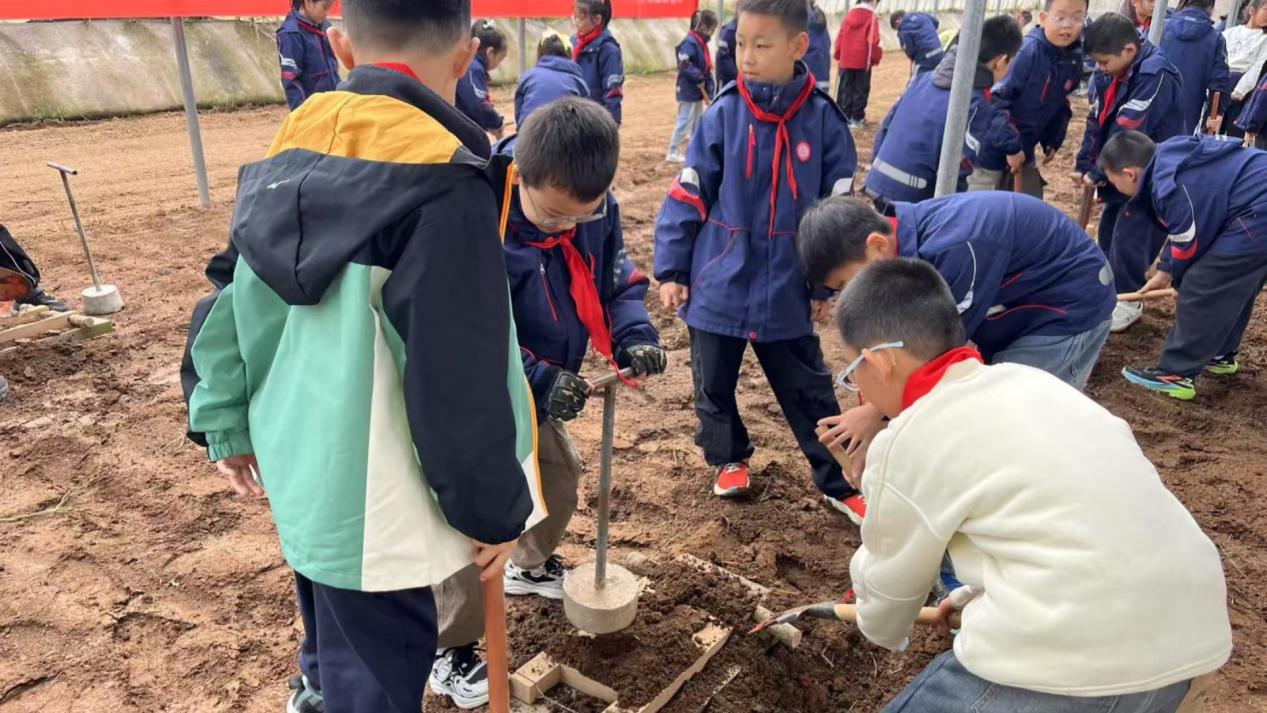 在农具体验环节,孩子们亲历了传统与现代劳动工具的碰撞。他们亲手触摸传统铁犁的厚重,感受其精巧构造,又目睹大型机械犁地机的高效作业,直观感受工业革命带来的劳动工具变革。在老师讲解与实操中,孩子们不仅掌握犁地技巧,更深刻理解“劳动工具进步推动生产力发展”的道理。老式打孔机与现代化播种机的“功能比拼”则让孩子们在实践中养成认真负责、安全规范的劳动习惯。夯土造墙(打胡基)体验更让孩子们通过挥汗如雨的劳作,体会到传统农耕生活的艰辛,在“以劳树德”中塑造坚韧品格。