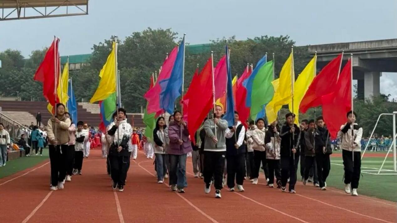 运动会开幕式在庄严的升旗仪式中拉开帷幕。由高帆、吴李睿两位教师主持的开幕式上,国旗护卫队、校旗队率先入场,鲜红的旗帜在晨光中猎猎生辉。紧随其后的彩旗方阵以红、蓝、黄、绿四色旗帜演绎“热血、理想、朝阳、活力”的青春意象,鼓号队则以铿锵有力的号角声奏响运动乐章。各年级方阵身着统一服装,以整齐的步伐、嘹亮的口号展现班级风采,形成一道道亮丽的青春风景线。