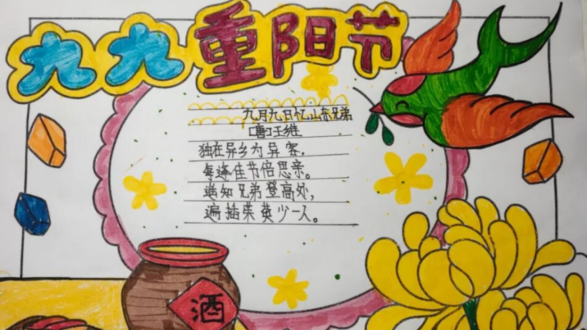 “传”的创新表达则展现童心巧思。他们主动查阅、收集与“重阳节”“敬老爱老”相关的经典诗词,再以书法、绘画、手抄报等多样形式创意展示,将对传统的敬意与对亲情的爱意,都凝于笔尖、落于纸上。这些融合传统与童趣的创作,既是对重阳文化的艺术诠释,更是对敬老美德的生动传承。