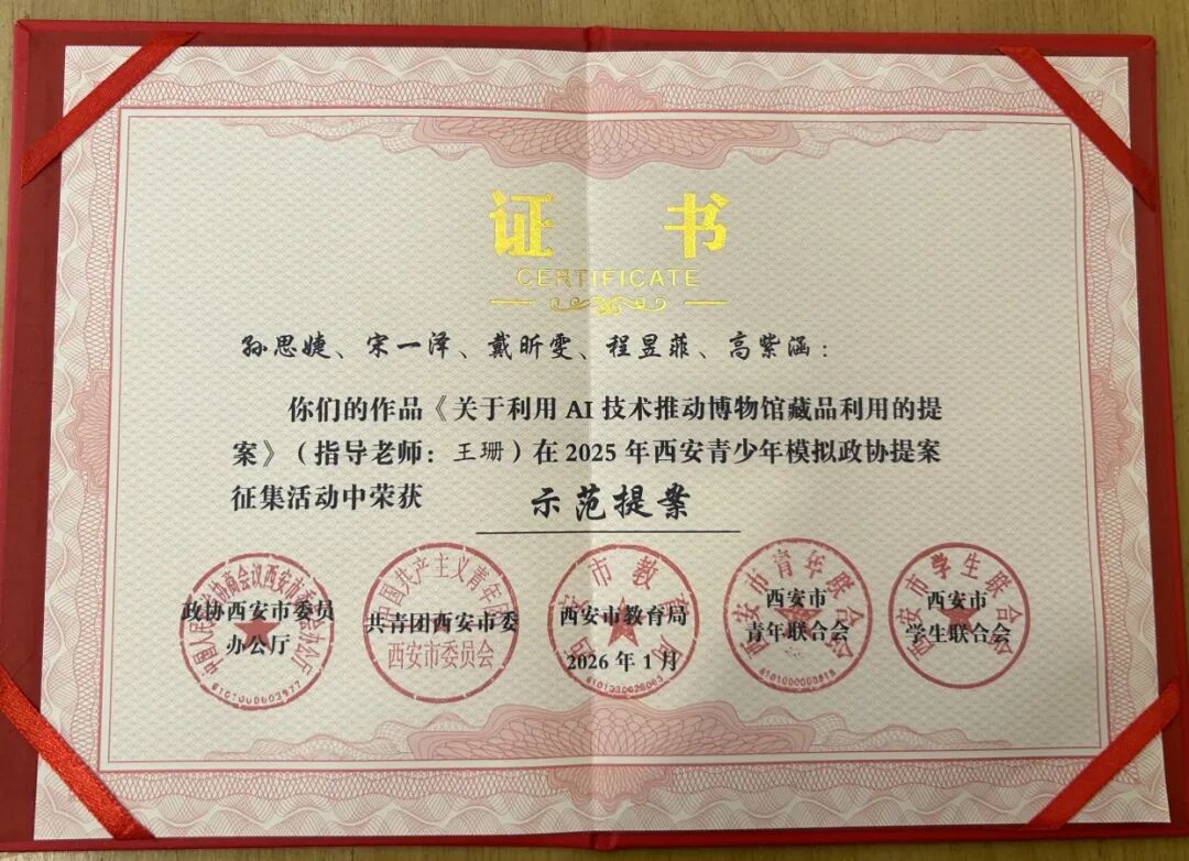 “在2025年西安市模拟政协大赛中,我校模拟政协社团提交的《关于运用AI技术推动博物馆藏品利用的提案》荣获‘示范提案’称号,展现了青少年对社会发展问题的深度思考与担当精神。”西安市庆华中学社团相关负责人难掩心中喜悦。