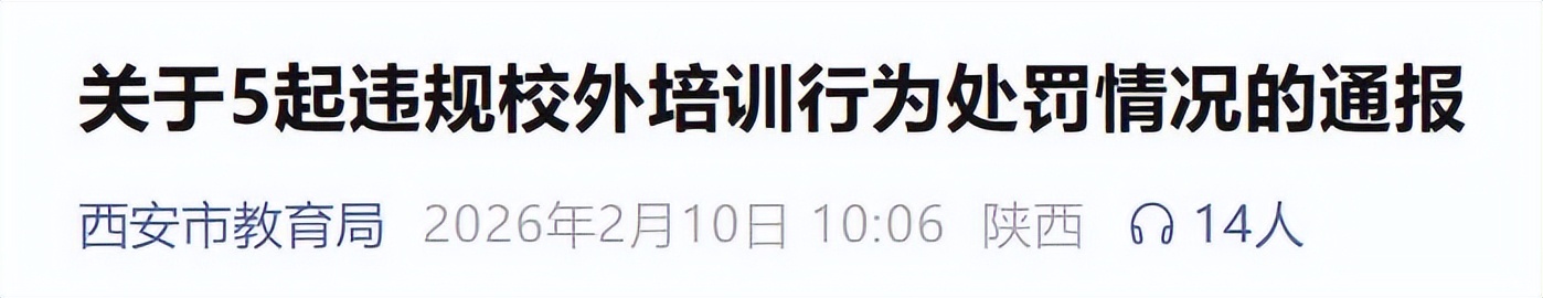 2月10日,西安市教育局发布信息,对寒假期间查处的5起违规开展学科类培训行为进行公开通报。